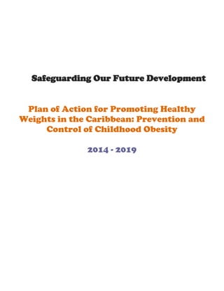 This document outlines a plan of action for promoting healthy weights and preventing childhood obesity in the Caribbean from 2014 to 2019. It aims to halt and reverse the rise in childhood obesity in the region by 2025 through multi-sectoral cooperation. The plan proposes measures to create healthier environments for children, provide incentives for healthy choices, empower communities, educate families, and support children affected by obesity. It also includes strengthening systems and capacity to effectively monitor and achieve results. The plan was developed with input from regional experts and partners, and provides a comprehensive public health response to address the underlying social and economic factors fueling the childhood obesity epidemic in the Caribbean.
