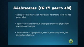 This document provides information about puberty, reproductive health, sexually transmitted infections, and HIV/AIDS for adolescents. It defines puberty and the physical and emotional changes that occur. It discusses the male and female reproductive systems and menstrual cycle. It aims to provide adolescents with accurate information to make responsible decisions about relationships and sexuality while dispelling common myths. The key messages are that menstruation is a normal part of development and communication between partners is important for family planning and preventing STIs including HIV.