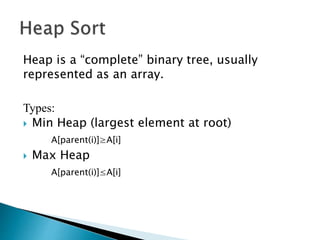 Heap is a complete binary tree represented as an array. There are two main types: min heap and max heap. A max heap has the largest element at the root and each parent is greater than or equal to its children. Heap sort uses the heap property to sort an array in O(n log n) time. It first builds a max heap from the array. Then it repeatedly removes the maximum element from the heap, adding it to the sorted portion of the array.