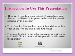 This document provides information about heaps from Sheetal Waghmare of IIT Kharagpur. It defines a heap as a binary tree that satisfies the structure and heap order properties. A max heap is defined where each parent node has a value greater than its children, and a min heap is defined where each parent node has a value less than its children. Examples of max and min heaps are shown. The processes of reheap up and reheap down for inserting and deleting from a heap using an array representation are also briefly described.