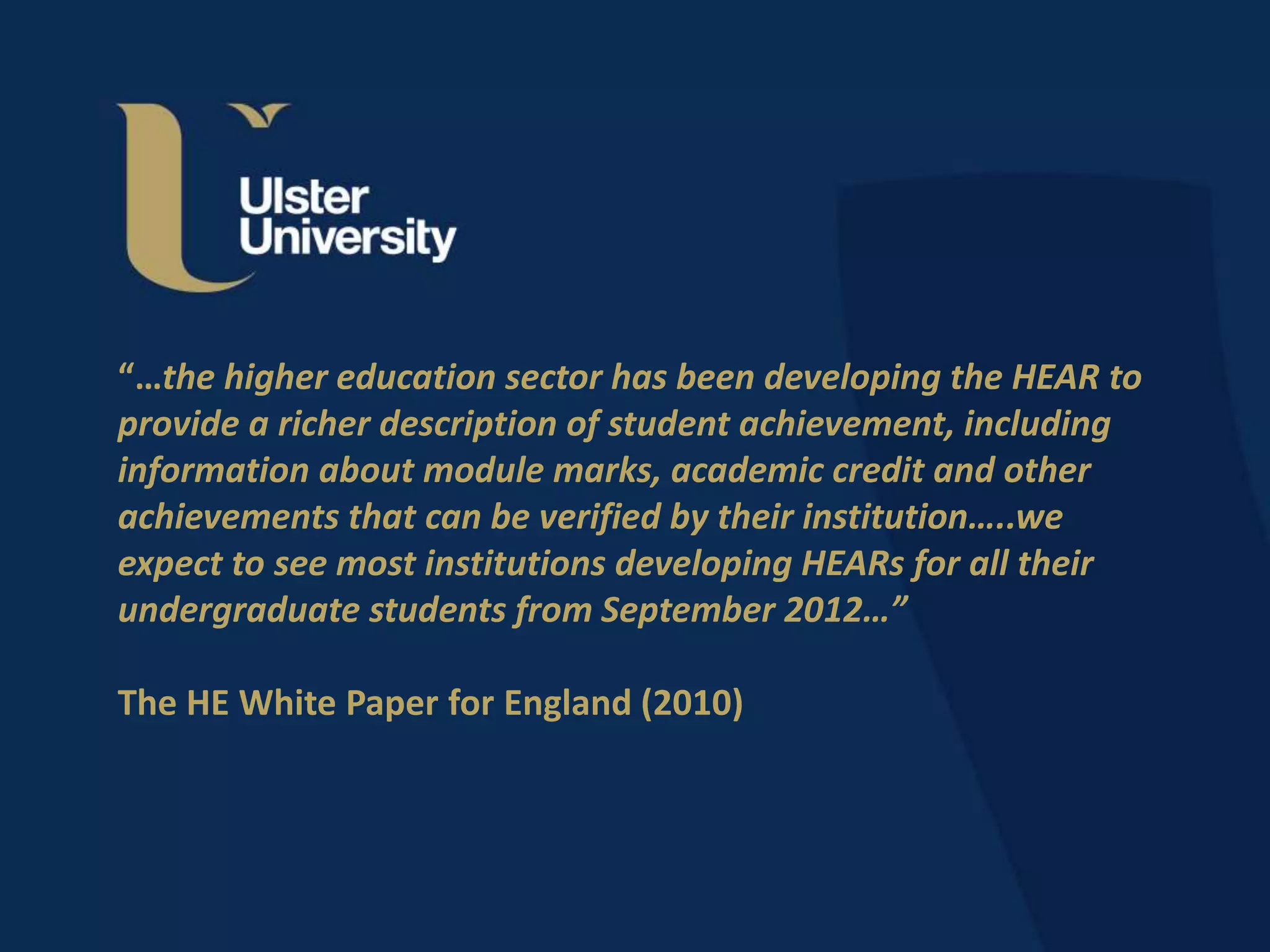 The document discusses the development of the Higher Education Achievement Report (HEAR) at Ulster University. It provides background on the HEAR, which comprehensively documents student achievements both inside and outside the formal curriculum. Ulster has been working to implement the HEAR, starting with a basic system utilizing existing data and expanding to an external platform to issue HEARs to 2015 graduates. Moving forward, challenges include ongoing maintenance, verification processes, inclusion of additional achievement types, and scaling the HEAR to cover all students.