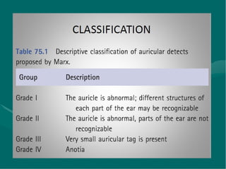 The document discusses various abnormalities that can affect the ear. It describes abnormalities in the external ear like microtia (underdeveloped pinna), anotia (absence of pinna), prominent ears, and ear canal stenosis. Abnormalities of the middle ear discussed include ossicular deformities and mandibulofacial dystosis. Inner ear abnormalities mentioned are cochlear malformations like Michel's deformity, incomplete partition types 1 and 2, vestibular malformations, semicircular canal malformations, and internal auditory canal malformations.