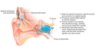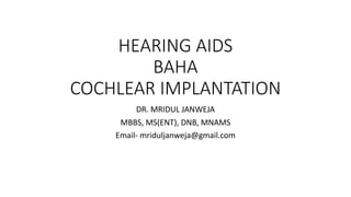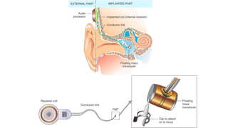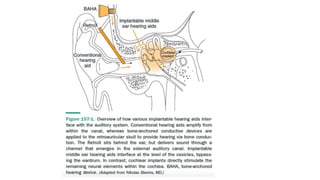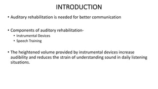 The document provides a comprehensive overview of auditory rehabilitation, including the use and types of hearing aids, cochlear implants, and their evaluation. It details various auditory training methods, components of hearing aids, their acoustic properties, as well as candidacy profiles and the procedure for implantable devices like bone-anchored hearing aids and middle ear implants. The information is aimed at understanding the various options available for individuals with hearing loss, including their advantages, indications, and complications.