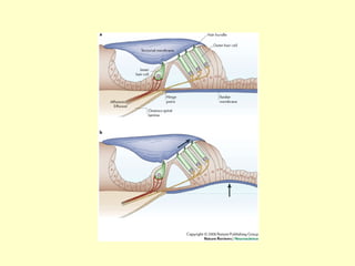 The ear is divided into three main sections - the outer, middle and inner ear. The outer ear collects sound waves and directs them to the eardrum. The middle ear contains three small bones that transmit vibrations from the eardrum to the inner ear. The inner ear contains the cochlea, which converts sound waves into electrical signals perceived as sound. It also contains organs that sense body movement and position, maintaining equilibrium.