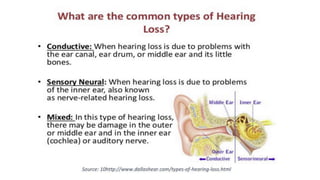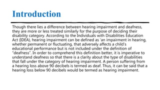 The document discusses hearing impairment and its classification, emphasizing the difference between hearing impairment and deafness, and outlines the types of hearing loss (conductive, sensorineural, and mixed). It details the educational challenges faced by students with hearing impairments and the importance of individualized support and strategies for their learning. Additionally, it highlights provisions and legislative actions taken by the Indian government to support individuals with hearing impairments through education and rehabilitation services.