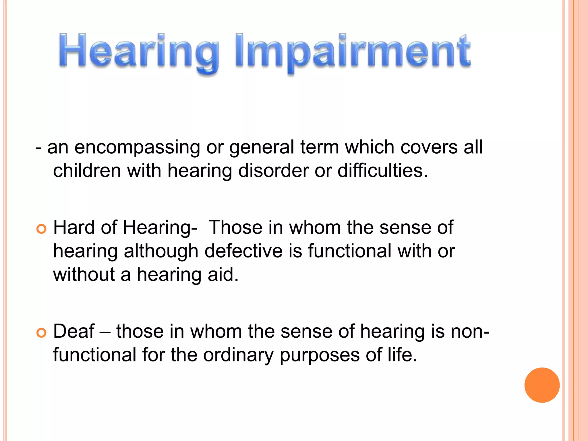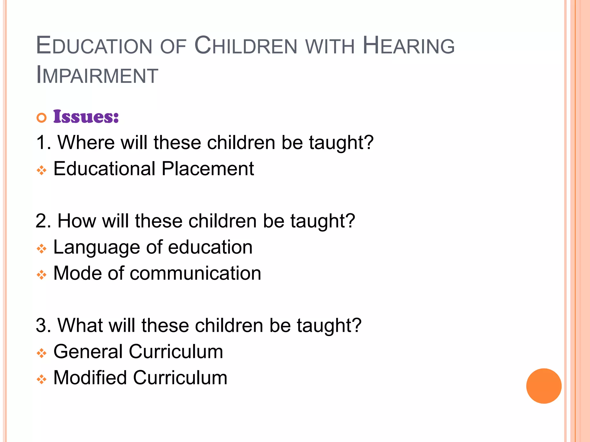 This document discusses education for children with hearing impairments. It addresses where they should be taught (educational placement options include self-contained classrooms, partial mainstreaming, and full mainstreaming), how they should be taught (considering language of education and communication modes), and what they should be taught (general vs modified curriculum). It provides suggestions for promoting inclusive classrooms and lists basic principles for inclusive instruction, such as differentiating, providing supports, and using effective teaching strategies that benefit all students. The goal of transition education is to help students achieve quality of life after school by gaining basic, thinking, and personal skills as outlined by the Secretary's Commission on Achieving Necessary Skills.