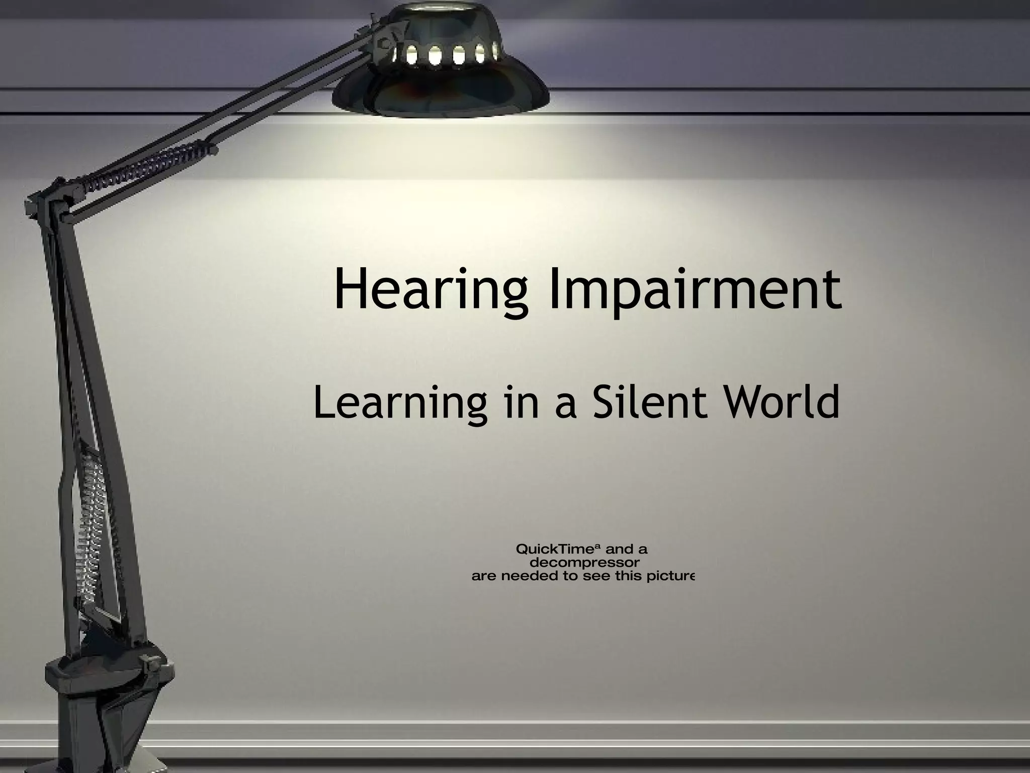 Hearing impairment affects millions of Americans. It can be caused by damage to the inner ear, obstructions, or genetic factors. Communication methods for the hearing impaired include American Sign Language, signed English, speech reading, cued speech, and oral communication. In the classroom, teachers should face students, write on boards, provide printouts, and be aware of classroom noise and positioning to help hearing impaired students learn.