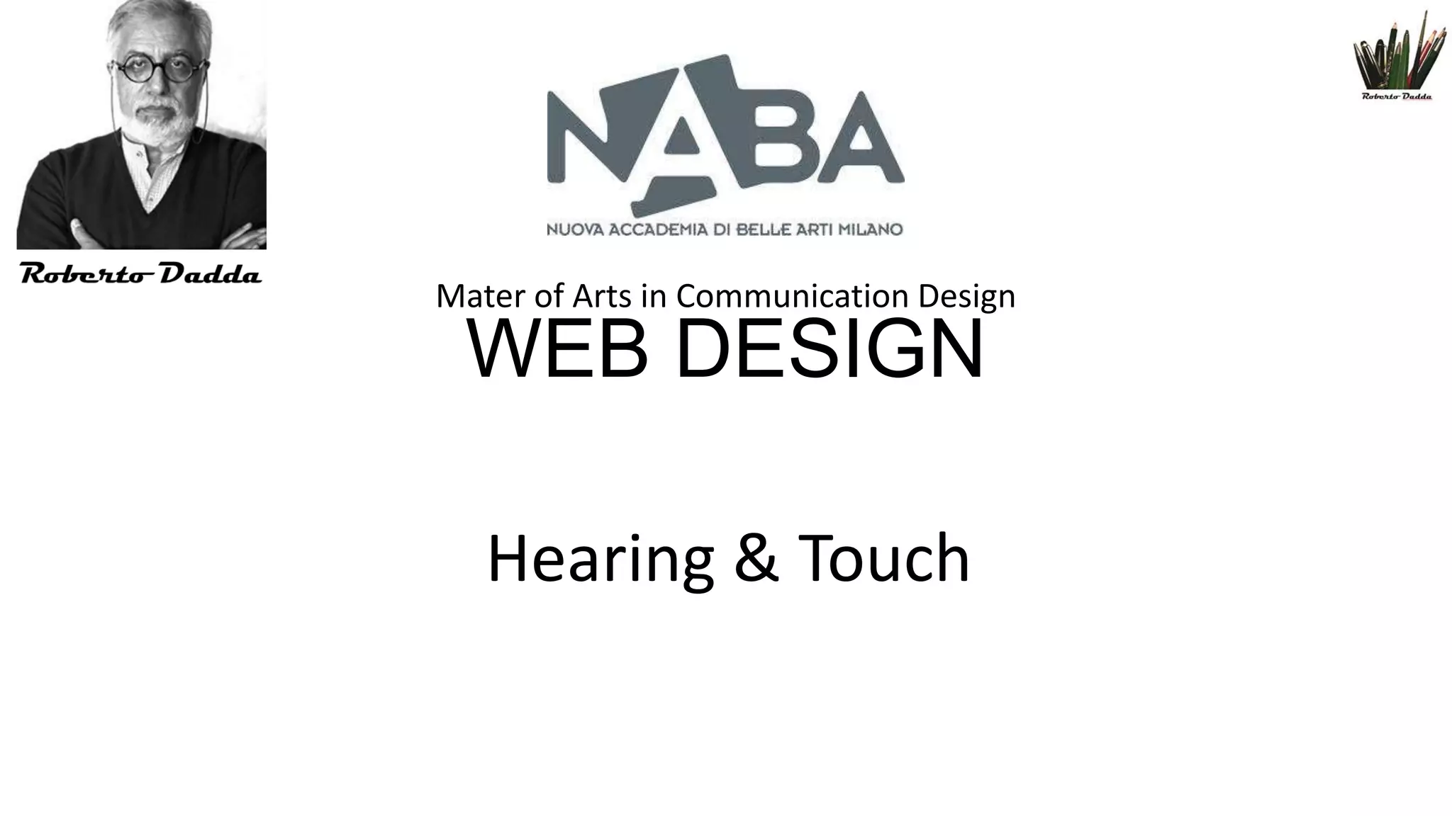 This document discusses sound and touch as it relates to web design. It covers topics such as the human ability to hear different pitches, intensities and tone colors of sound. Human hearing ranges from 16-20 Hz to 16 KHz and is most sensitive in the center. Touch is discussed, including the different nerve endings and our ability to feel pressure, warmth and cold. The document presents information on haptics and how touch can be used for nonverbal communication. It concludes with information about the presenter, Roberto Dadda.