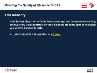The document outlines updates regarding the construction and modernization of Hearst Elementary School, including a timeline for external construction, the erection of a two-story trailer, and restroom accommodations. Turner Construction has been awarded the project, with work scheduled to begin in April 2013 and completed by the summer. Future communication updates will be provided via email and on the DGS website, with direct inquiries directed to Darrell Pressley.