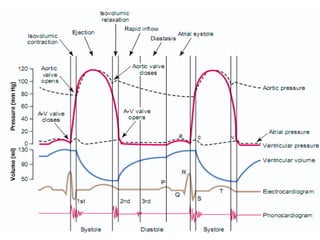 - The cardiac cycle and components such as atrial systole, ventricular ejection, and filling phases