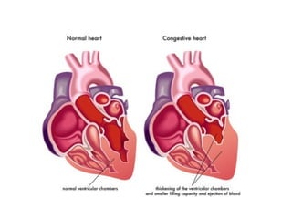 The document summarizes the anatomy and basic function of the heart. It discusses the heart's size, location, chambers, blood flow pathways (pulmonary and systemic circulation), and electrical conduction system. It also briefly describes common cardiovascular problems like hypertension, congestive heart failure, and ischemic heart disease.