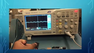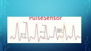 A pulse oximeter uses light to measure the oxygen saturation level in a patient's blood. It works by passing light through tissue and measuring how much light is absorbed. The document describes the circuit design of a pulse oximeter, including an LC oscillator to generate a 5kHz signal, filters to isolate the desired frequency, amplifiers to boost the signal, and a comparator to generate a square wave output. It discusses the principles of operation, gain levels, sensitivity achieved, and challenges in simulating and implementing the circuit. The goal is to create a low-cost heart rate monitor using common amplifier and filter components.