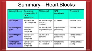 Heart block occurs when the electrical signals that tell the heart to contract are partially or totally blocked between the atria and ventricles, causing the heart to beat too slowly. There are three main types of heart block - first degree, second degree, and third degree (complete heart block). The type of heart block depends on how much the electrical signals are blocked. More advanced heart blocks require treatment such as pacemakers while milder forms often do not require treatment.
