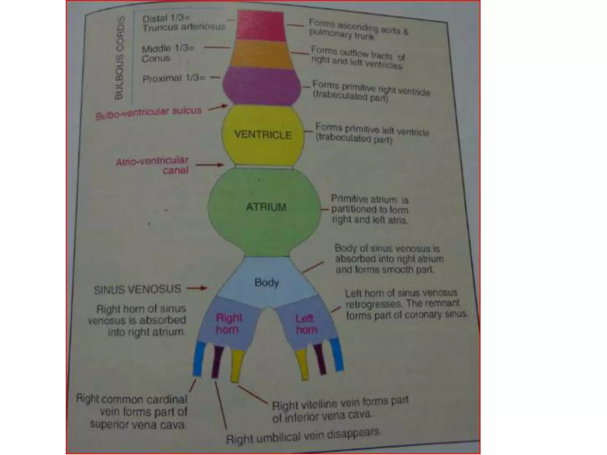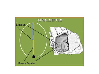 1. The document discusses the embryonic development of the heart, including the septation of the common atrium and ventricle to form the four chambers.