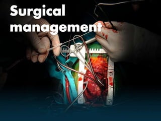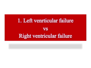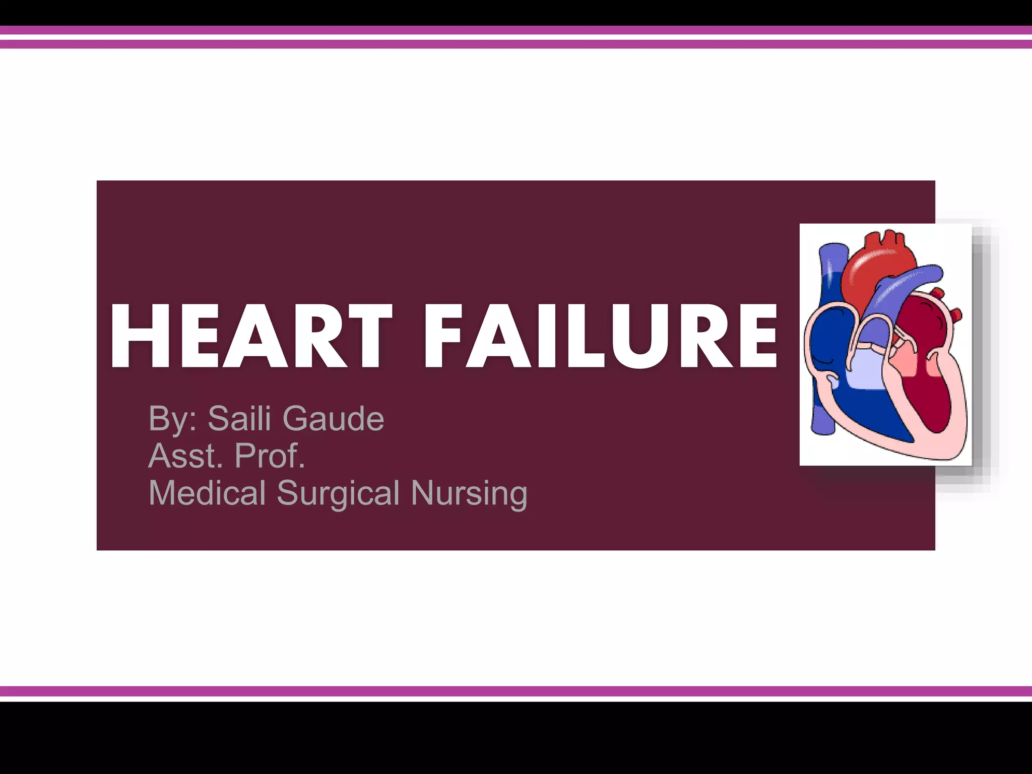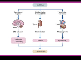 Heart failure is a condition where the heart cannot pump enough blood to meet the body's needs. It can be caused by conditions that weaken the heart muscles. Symptoms depend on whether the left or right side of the heart is affected but may include shortness of breath, fatigue, swelling of legs/abdomen. Diagnosis involves checking for elevated BNP, abnormalities on ECG/CXR, and reduced ejection fraction on echocardiogram. Treatment focuses on reducing pre/afterload, increasing cardiac output, restricting fluids/sodium, and controlling symptoms. For severe cases, devices, transplantation or specialized surgeries may be considered.