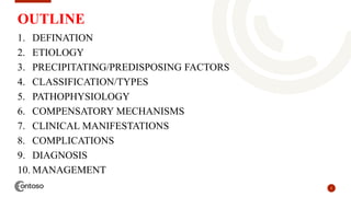 This document provides an outline on heart failure, covering definitions, etiology, pathophysiology, clinical manifestations, complications, diagnosis, and management. Heart failure is defined as a condition where the heart cannot pump enough blood to meet the body's needs. The most common causes are high blood pressure and structural heart issues. The pathophysiology involves compensatory mechanisms like activation of the sympathetic nervous system and renin-angiotensin-aldosterone system. Clinical manifestations include dyspnea, edema, fatigue, and liver enlargement. Management involves drug therapy like diuretics and ACE inhibitors, as well as lifestyle changes like sodium and fluid restriction.