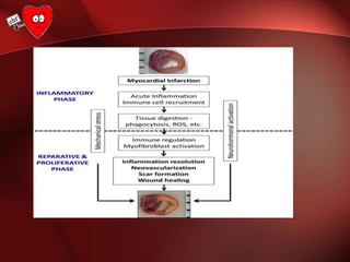 The document discusses the biological basis of cardiac repair after myocardial infarction. It notes that massive cardiomyocyte loss due to infarction overwhelms the heart's limited regenerative capacity, resulting in scar formation. Necrotic cells trigger an intense inflammatory response through danger signals and toll-like receptor signaling that recruits leukocytes. As inflammation subsides, fibroblasts proliferate and deposit collagen, maintaining ventricular integrity. Dysregulated inflammation, impaired resolution, or excessive fibrosis can cause adverse remodeling and heart failure. Modulating the inflammatory and reparative response may prevent post-infarction heart failure.
