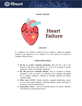 This document provides information about heart failure including its definition, causes, symptoms, diagnosis, and treatment. Heart failure occurs when the heart is unable to supply sufficient blood to meet the body's needs. It can be caused by systolic or diastolic ventricular dysfunction, valvular abnormalities, or other cardiac or extracardiac issues. Common symptoms include dyspnea, fatigue, edema, and hepatomegaly. Diagnosis involves examinations like echocardiography and tests such as electrocardiograms and natriuretic peptide levels. Treatment focuses on managing symptoms, addressing the underlying cause, and may include medications like ACE inhibitors, beta-blockers, diuretics, and anticoagulants.