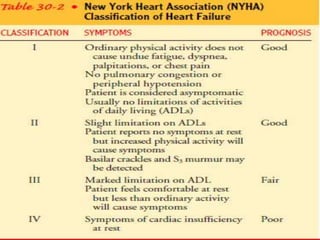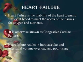 Heart failure is the inability of the heart to pump sufficient blood to meet the needs of tissues. It results in fluid overload and poor tissue perfusion. It has multiple causes including reduced contractility, valve disorders, coronary artery disease, and hypertension. Symptoms vary between acute pulmonary edema with respiratory distress, and chronic fatigue and edema. Treatment involves reducing preload and afterload through medications like ACE inhibitors, ARBs, beta-blockers, vasodilators, and diuretics.