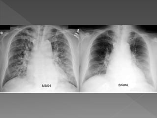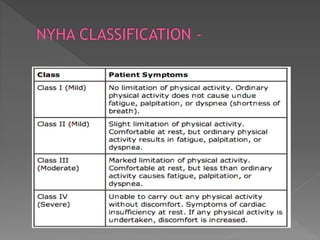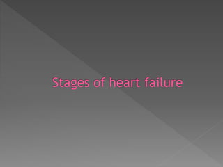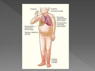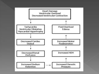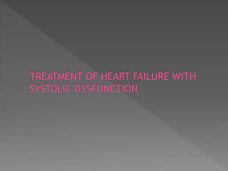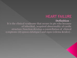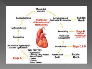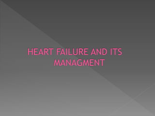 Heart failure is a common condition where the heart muscle is unable to pump sufficiently. It affects around 2% of developed countries' adult populations and risk increases with age. Heart failure can be systolic, with reduced ejection fraction below 40%, or diastolic, with preserved ejection fraction above 40-50%. Common causes include coronary artery disease, hypertension, valvular diseases, cardiomyopathies, and arrhythmias. Treatment focuses on managing symptoms, slowing disease progression, and reducing mortality risk through lifestyle changes, medications like diuretics, ACE inhibitors, beta-blockers, and aldosterone antagonists, and devices or procedures for advanced cases.