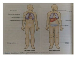 The document provides a comprehensive overview of heart failure, including its definitions, classifications based on ejection fraction, cardiac output, and associated symptoms. It outlines risk factors, clinical features, and physical examination findings relevant to heart failure, emphasizing the implications of left and right-sided failures. Additionally, it addresses the epidemiology, etiology, and potential comorbidities affecting patients with heart failure.