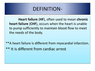 Heart failure (HF) is a condition where the heart cannot pump blood effectively to meet the body's needs, often distinguished into left-sided and right-sided failures with different symptoms and causes. Left-sided heart failure leads to pulmonary congestion and edema, while right-sided failure causes systemic edema and increased venous pressure. Diagnosis involves clinical signs, physical examination, and imaging, with treatment options including diuretics, vasodilators, and drugs to enhance myocardial function.