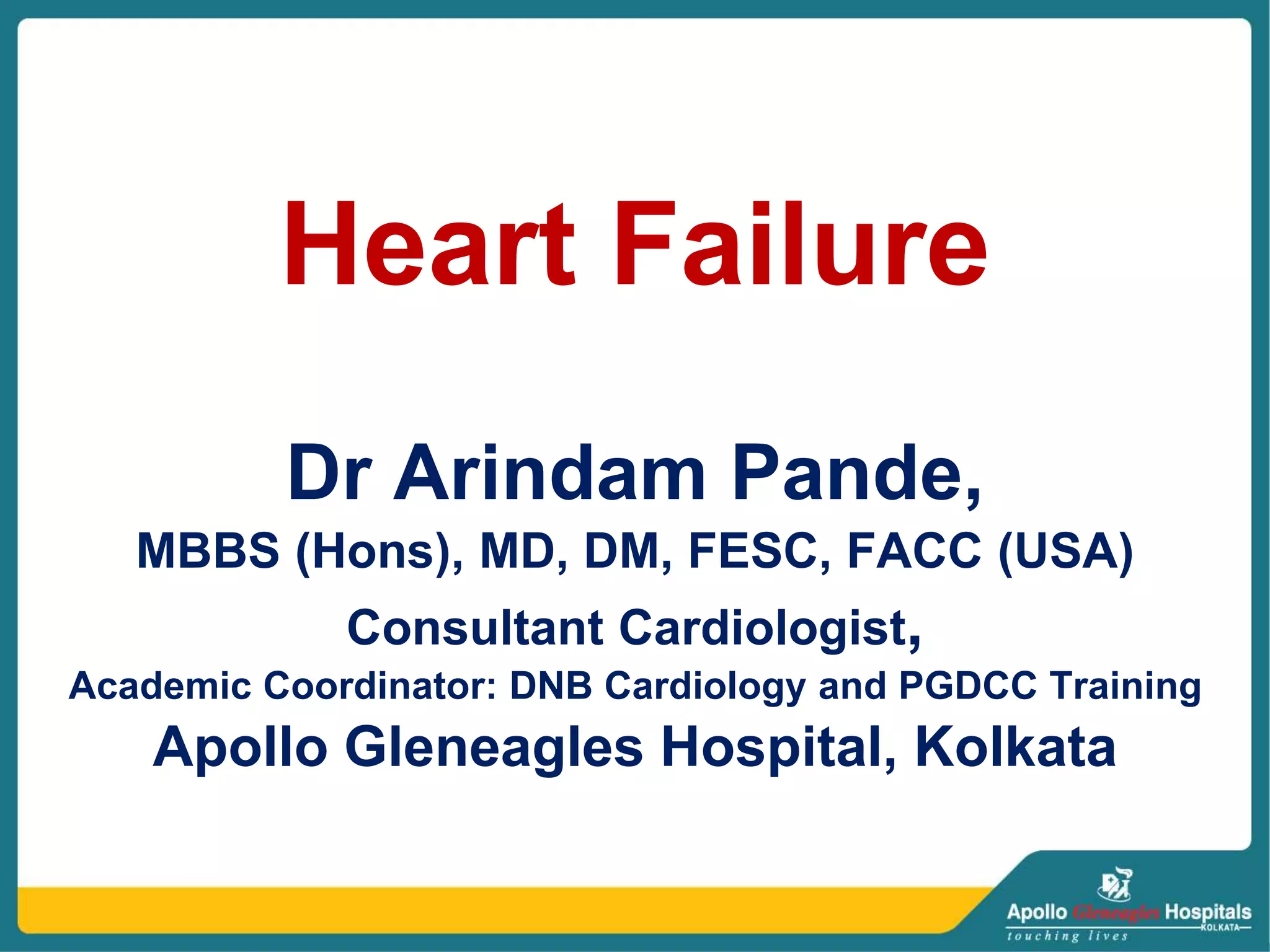 Heart failure occurs when the heart is unable to pump enough blood to meet the body's needs. It can develop when the heart muscle is damaged, such as from a myocardial infarction. There are two main types - left heart failure which causes blood to back up in the lungs, and right heart failure where blood backs up in the body. Symptoms depend on whether it is left or right heart failure, and include shortness of breath, fatigue, swelling, and coughing. Treatment focuses on reducing cardiac workload, increasing blood oxygen levels, and limiting fluid buildup through medications, oxygen therapy, and monitoring for arrhythmias.