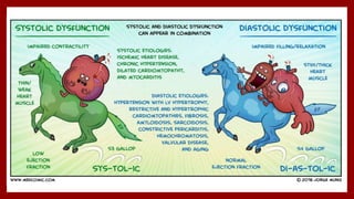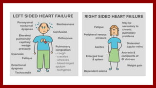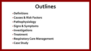 The document presents a detailed overview of heart failure, including its definitions, causes, risk factors, pathophysiology, signs and symptoms, investigations, and treatment options. It includes a case study of a 67-year-old man with ischemic cardiomyopathy, who experienced symptoms of acute decompensated heart failure and underwent various treatments, ultimately leading to a decrease in weight and improvement in symptoms. The document emphasizes the importance of respiratory care management in patients with cardiogenic pulmonary edema, highlighting specific therapeutic interventions.