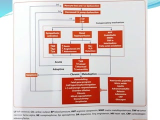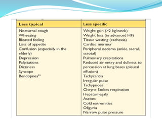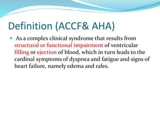 Heart failure is defined as a complex clinical syndrome resulting from the impairment of ventricular function, leading to symptoms such as dyspnea and fatigue, with a global prevalence of around 21 million adults. The etiology of heart failure in India is primarily due to uncontrolled hypertension and ischemic heart disease, with a rising incidence expected. Diagnosis and management guidelines emphasize the use of various biomarkers, imaging techniques, and tailored therapeutic approaches to improve clinical outcomes and reduce hospitalizations.