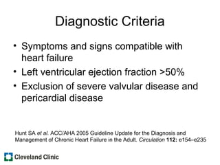 The document discusses evidence-based management of heart failure with preserved ejection fraction (HFpEF), detailing diagnostic criteria, pathophysiology, and epidemiology. It highlights the complexity of HFpEF, including comorbid conditions and non-diastolic mechanisms, and emphasizes the importance of proper diagnosis and treatment approaches. Ongoing clinical trials and various treatment strategies, including the use of traditional heart failure medications, are also mentioned.