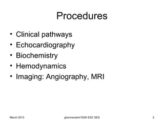 The document discusses diagnostic procedures for congestive heart failure, including clinical exams, echocardiography, blood tests, cardiac imaging like angiography and MRI, and hemodynamic monitoring. Key diagnostic tests are clinical exams, echocardiography to assess heart structure and function, blood tests like BNP to support diagnosis, and additional cardiac imaging tests like angiography to evaluate underlying heart conditions. Hemodynamic monitoring provides cardiac functional parameters but has limited clinical use due to its invasiveness.
