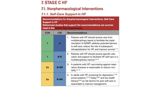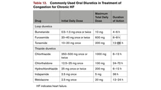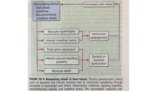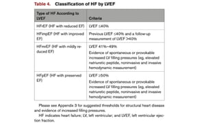 The document provides a comprehensive overview of heart failure (HF), defining its syndromes, phenotypes, and underlying causes, including various structural and functional abnormalities. It discusses the pathophysiology involving neurohormonal activation and mechanical dyssynchrony, along with the importance of timely evaluation and diagnosis through clinical history, physical examination, and imaging techniques. Treatment options for HF are summarized, highlighting medications and interventions aimed at managing symptoms and improving patient outcomes.