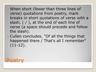 The document discusses Romantic poetry and how it is characterized by a spontaneous overflow of powerful feelings according to Wordsworth. It provides guidelines for quoting poetry, including breaking short verse quotations into lines separated by slashes. The document also provides suggestions for citing websites, including placing the URL in angle brackets after the date of access and breaking URLs only after slashes.