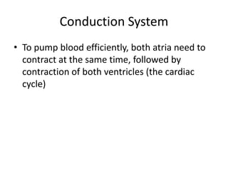 The document describes the conduction system of the heart, which coordinates contraction of the atria and ventricles. It is made up of the sinoatrial node, atrioventricular node, bundle of His, bundle branches, and Purkinje fibers. Together this system ensures the atria contract before the ventricles to efficiently pump blood throughout the body and heart. An electrocardiogram measures the electric currents produced during conduction to evaluate heart function.