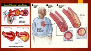 Heart disease involves various conditions affecting the heart and blood vessels, primarily caused by atherosclerosis, which narrows arteries due to plaque buildup. Symptoms can range from no discomfort to chest pain or heart attacks, with treatment options including lifestyle changes and surgery. Key prevention tips include maintaining a healthy lifestyle, managing blood pressure and cholesterol, and being informed about personal health risks.