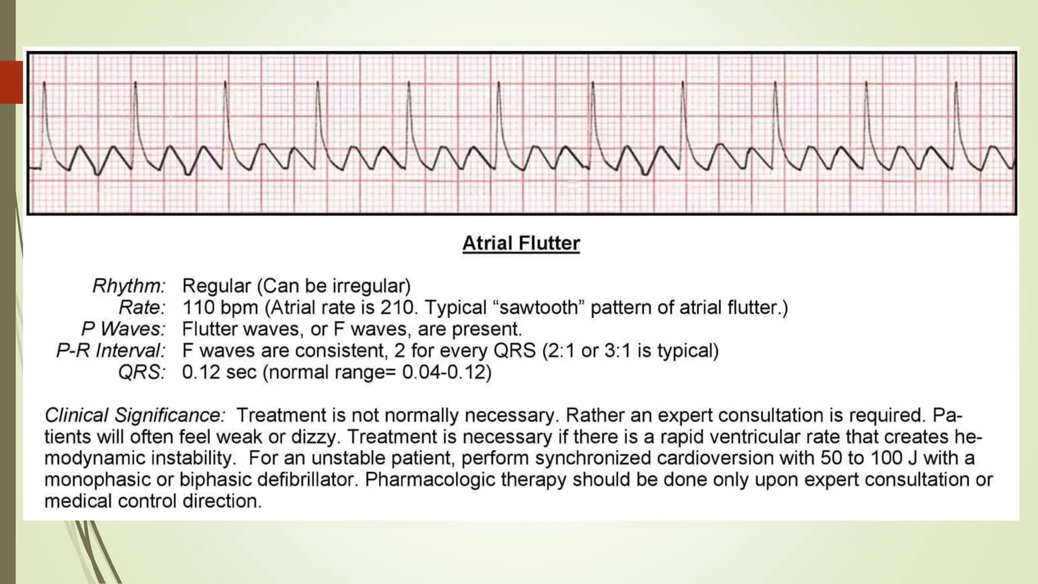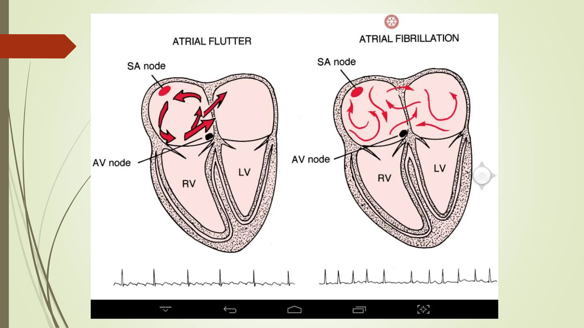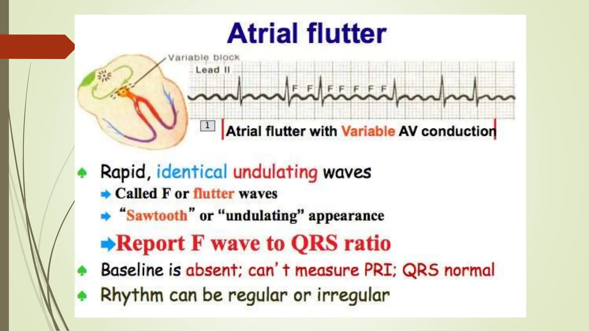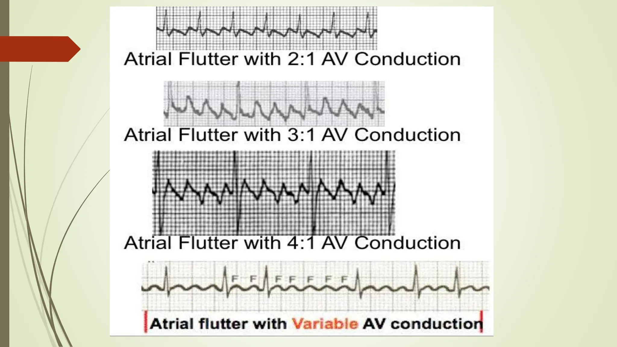 The document discusses various types of atrial flutter, including those with different block patterns such as 2:1, 4:1, and variable blocks, as well as conditions like high-grade AV block and 1:1 block. It also mentions AV nodal reentry tachycardia (AVNRT) and its reversion to sinus rhythm after an adenosine bolus. Additionally, atrial fibrillation is briefly referenced.