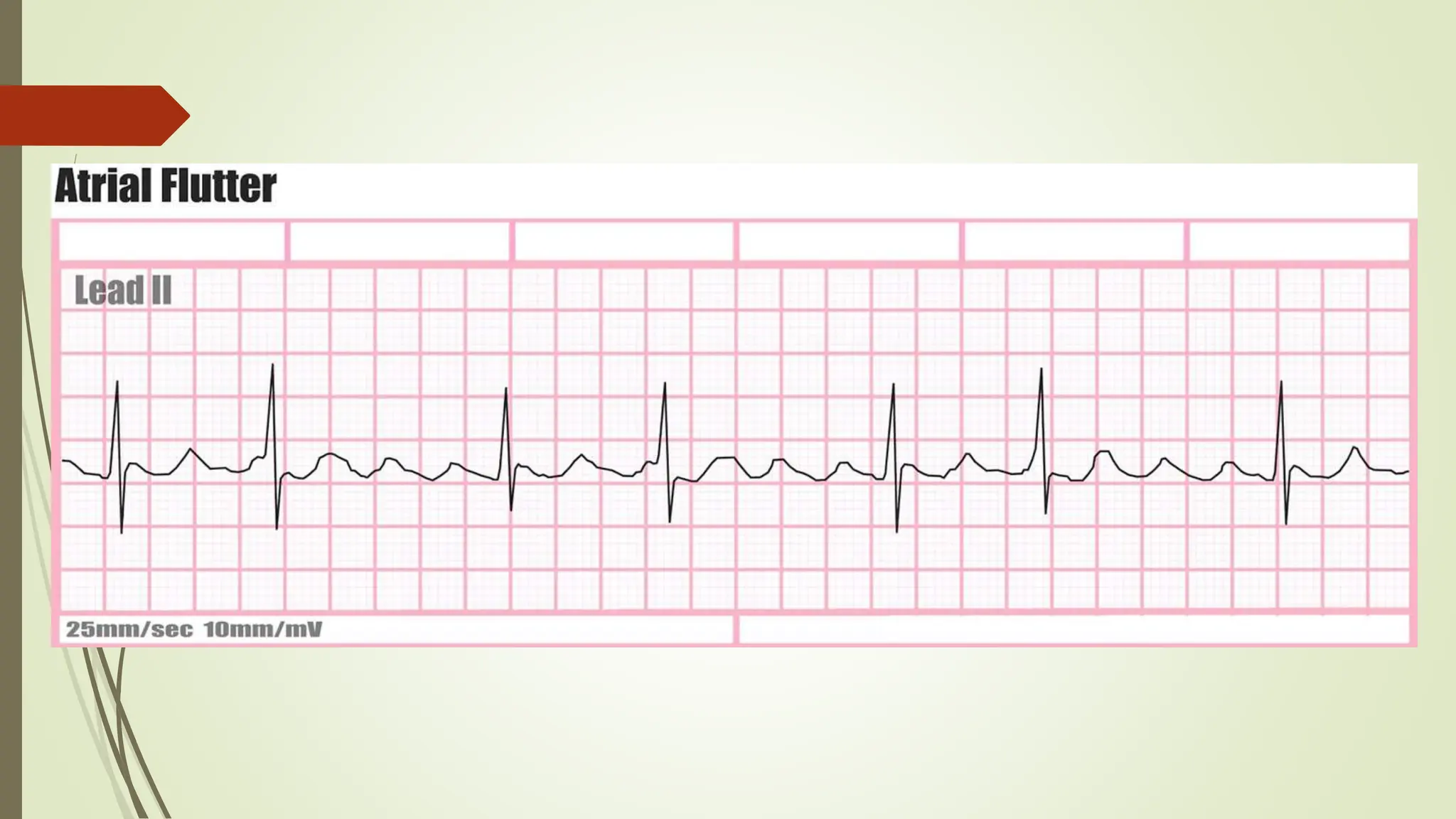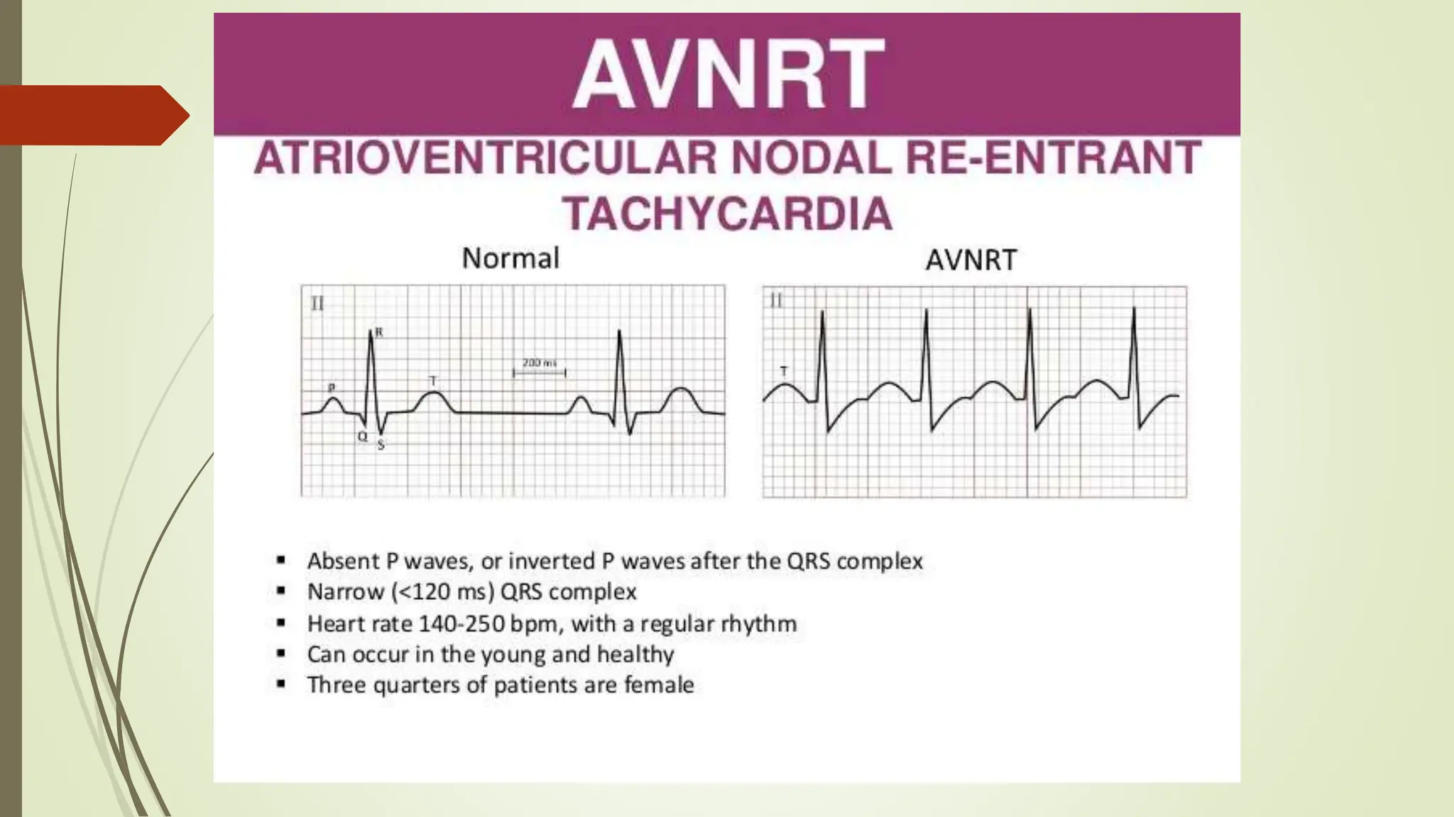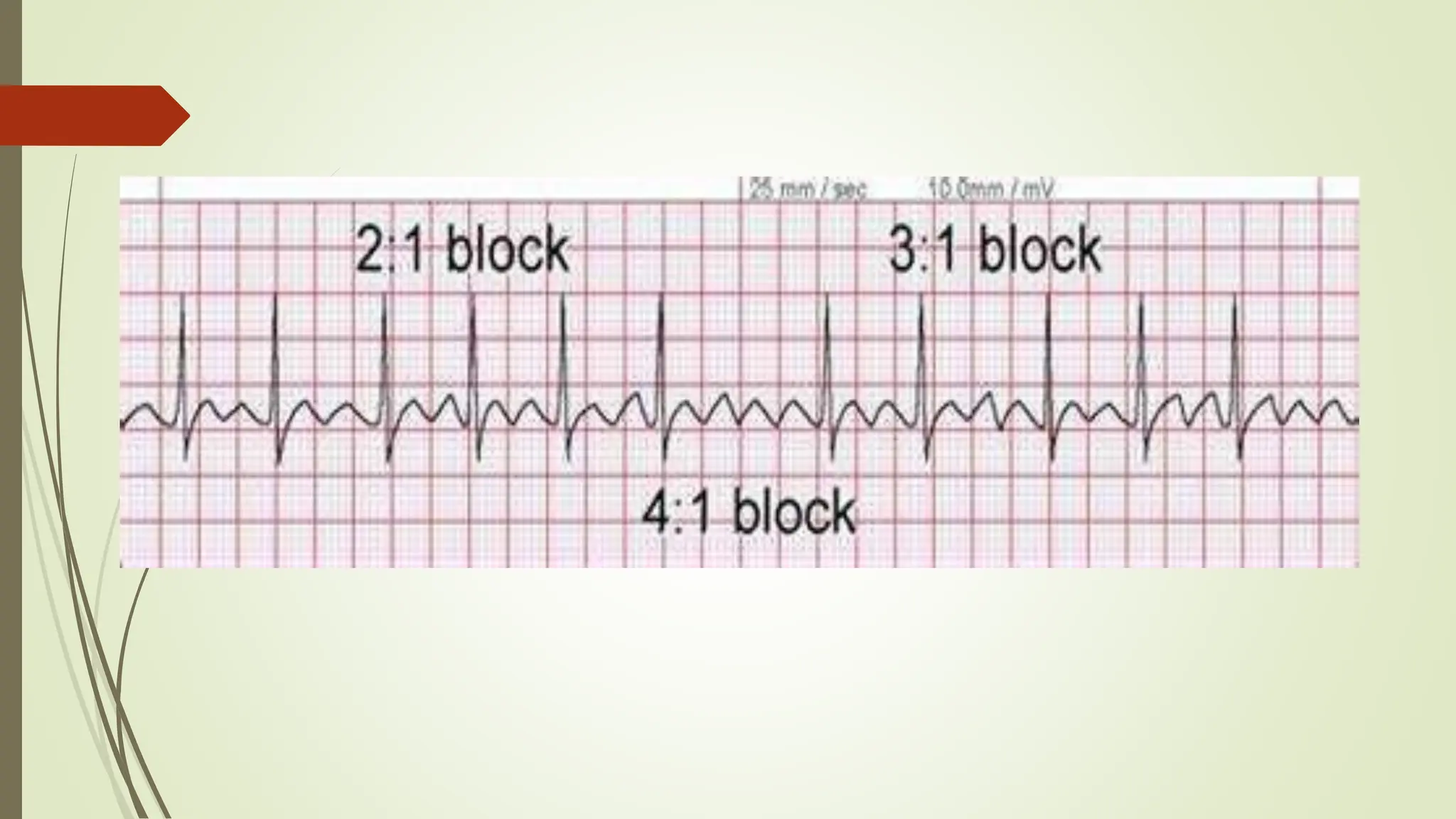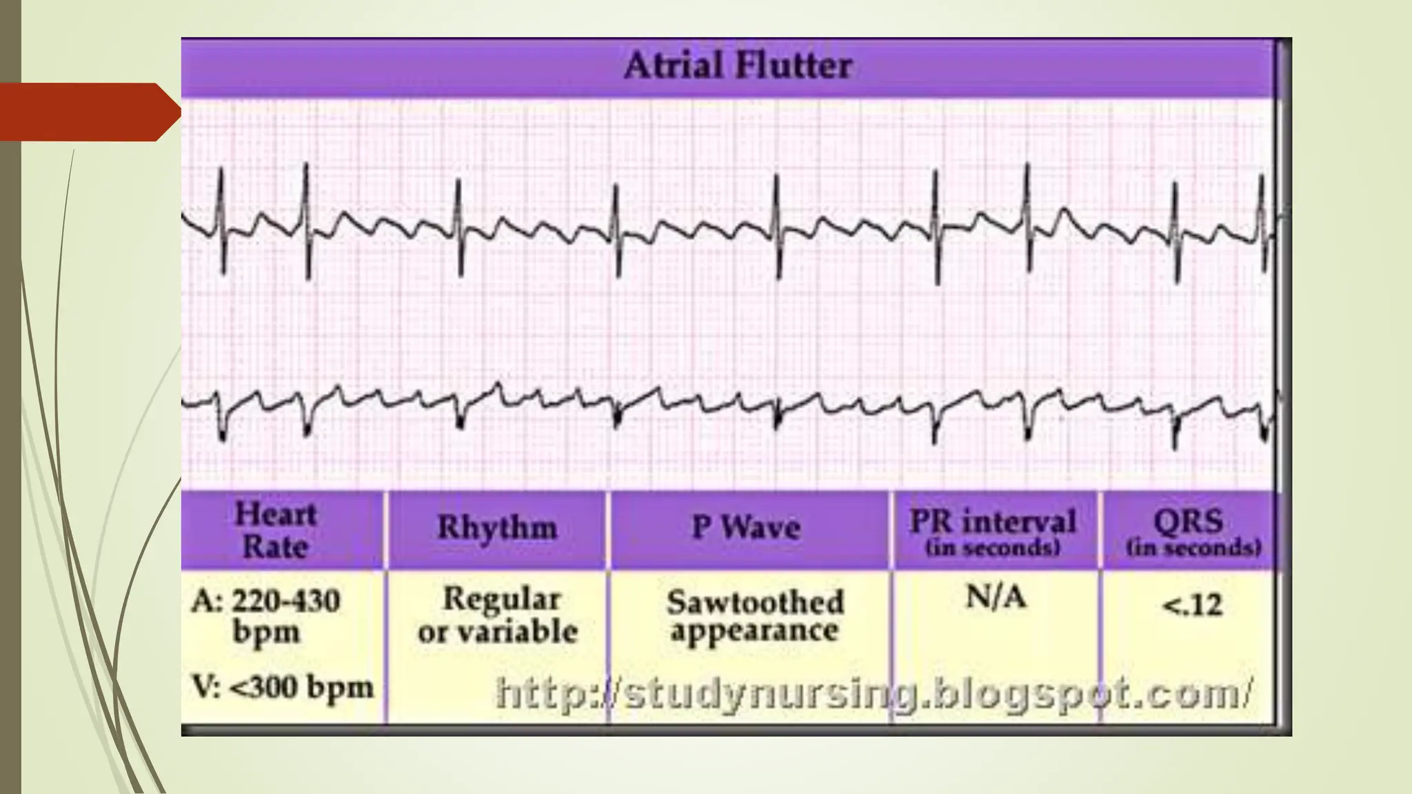 The document discusses various types of atrial flutter, including those with different block patterns such as 2:1, 4:1, and variable blocks, as well as conditions like high-grade AV block and 1:1 block. It also mentions AV nodal reentry tachycardia (AVNRT) and its reversion to sinus rhythm after an adenosine bolus. Additionally, atrial fibrillation is briefly referenced.
