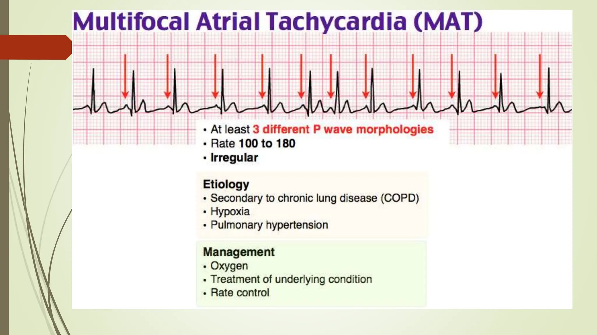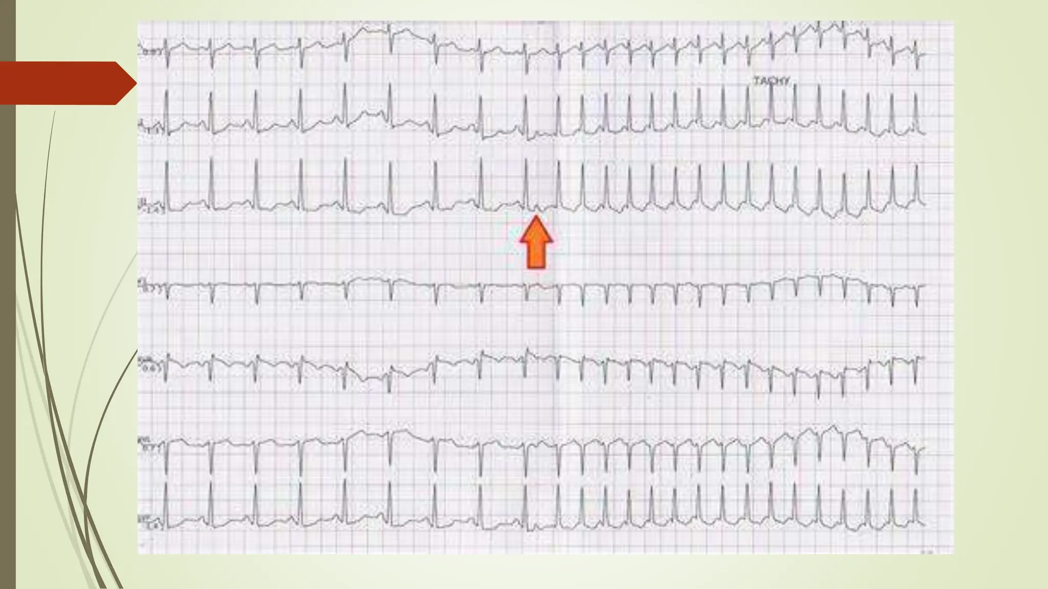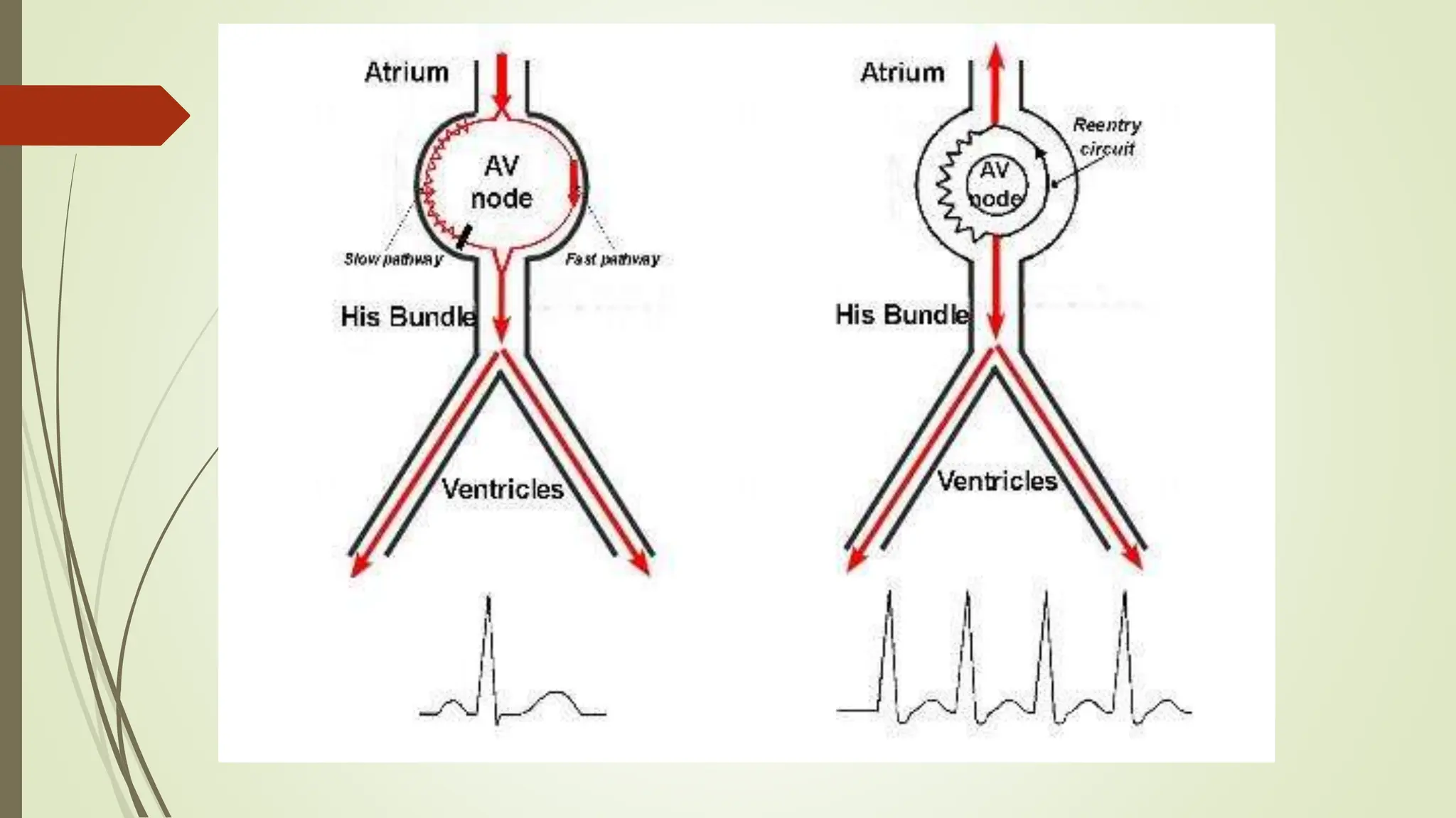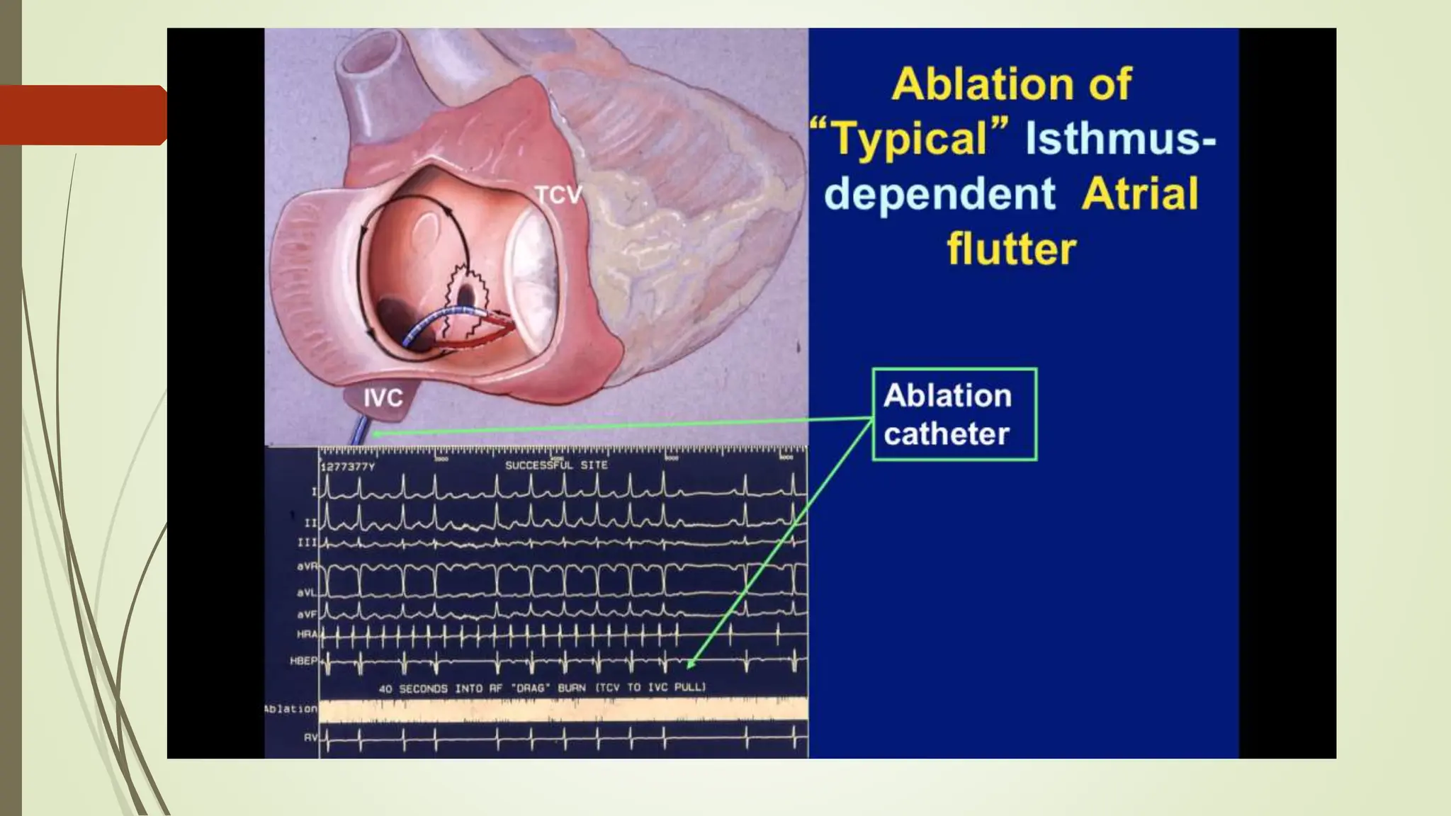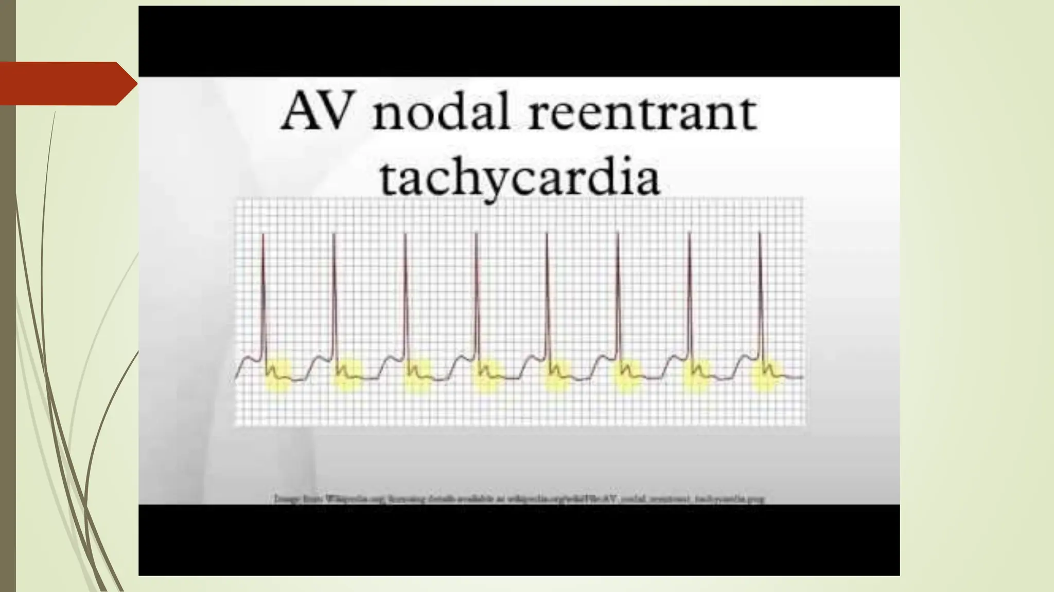 The document discusses various types of atrial flutter, including those with different block patterns such as 2:1, 4:1, and variable blocks, as well as conditions like high-grade AV block and 1:1 block. It also mentions AV nodal reentry tachycardia (AVNRT) and its reversion to sinus rhythm after an adenosine bolus. Additionally, atrial fibrillation is briefly referenced.