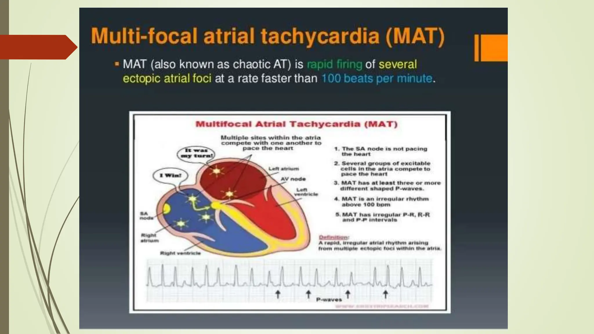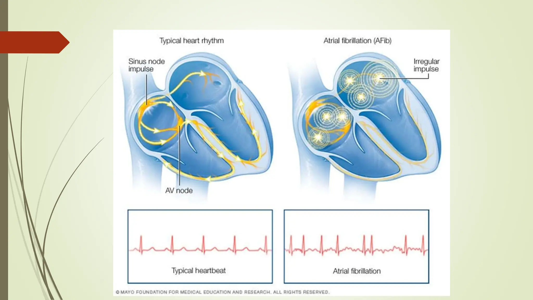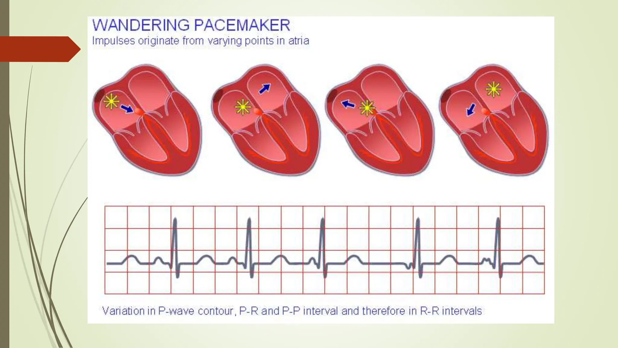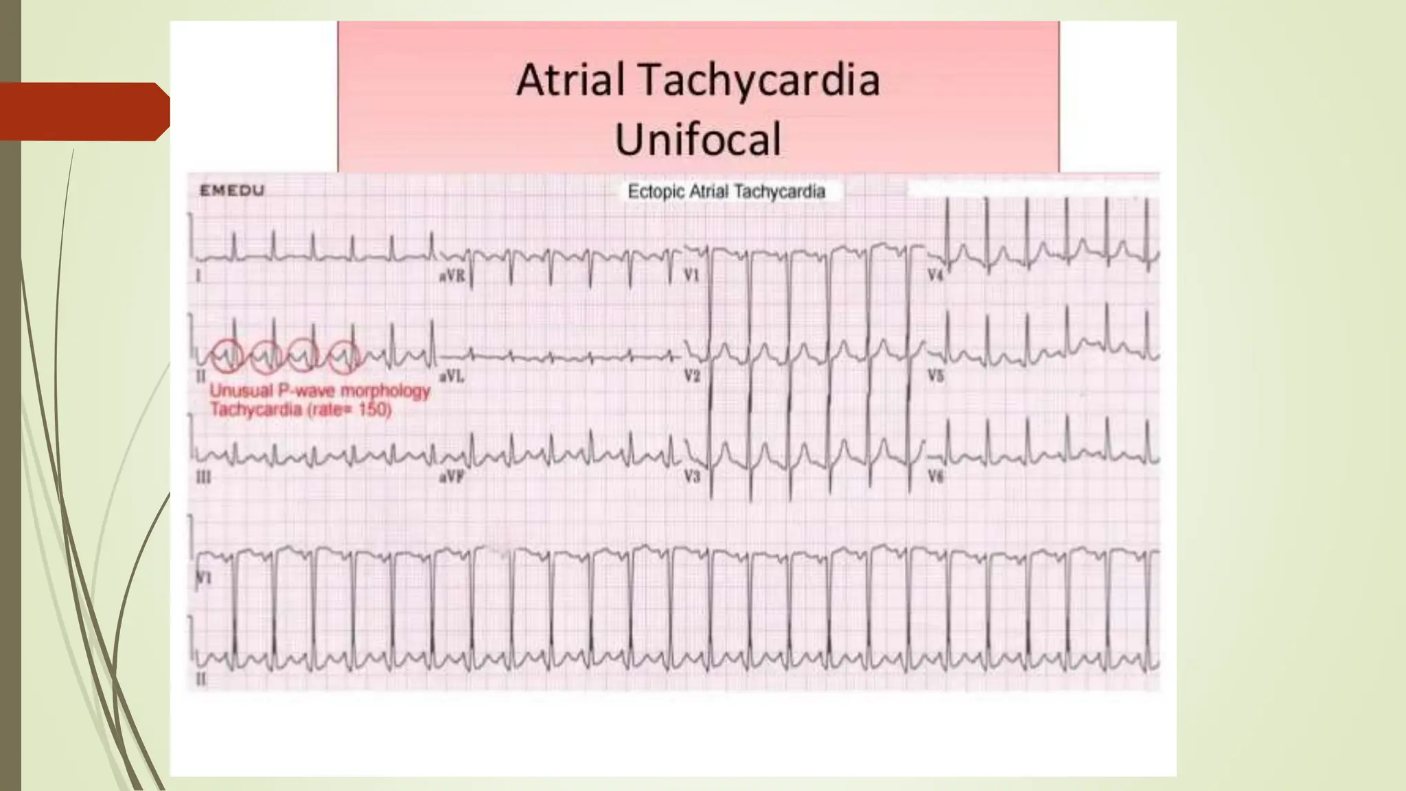 The document discusses various types of atrial flutter, including those with different block patterns such as 2:1, 4:1, and variable blocks, as well as conditions like high-grade AV block and 1:1 block. It also mentions AV nodal reentry tachycardia (AVNRT) and its reversion to sinus rhythm after an adenosine bolus. Additionally, atrial fibrillation is briefly referenced.