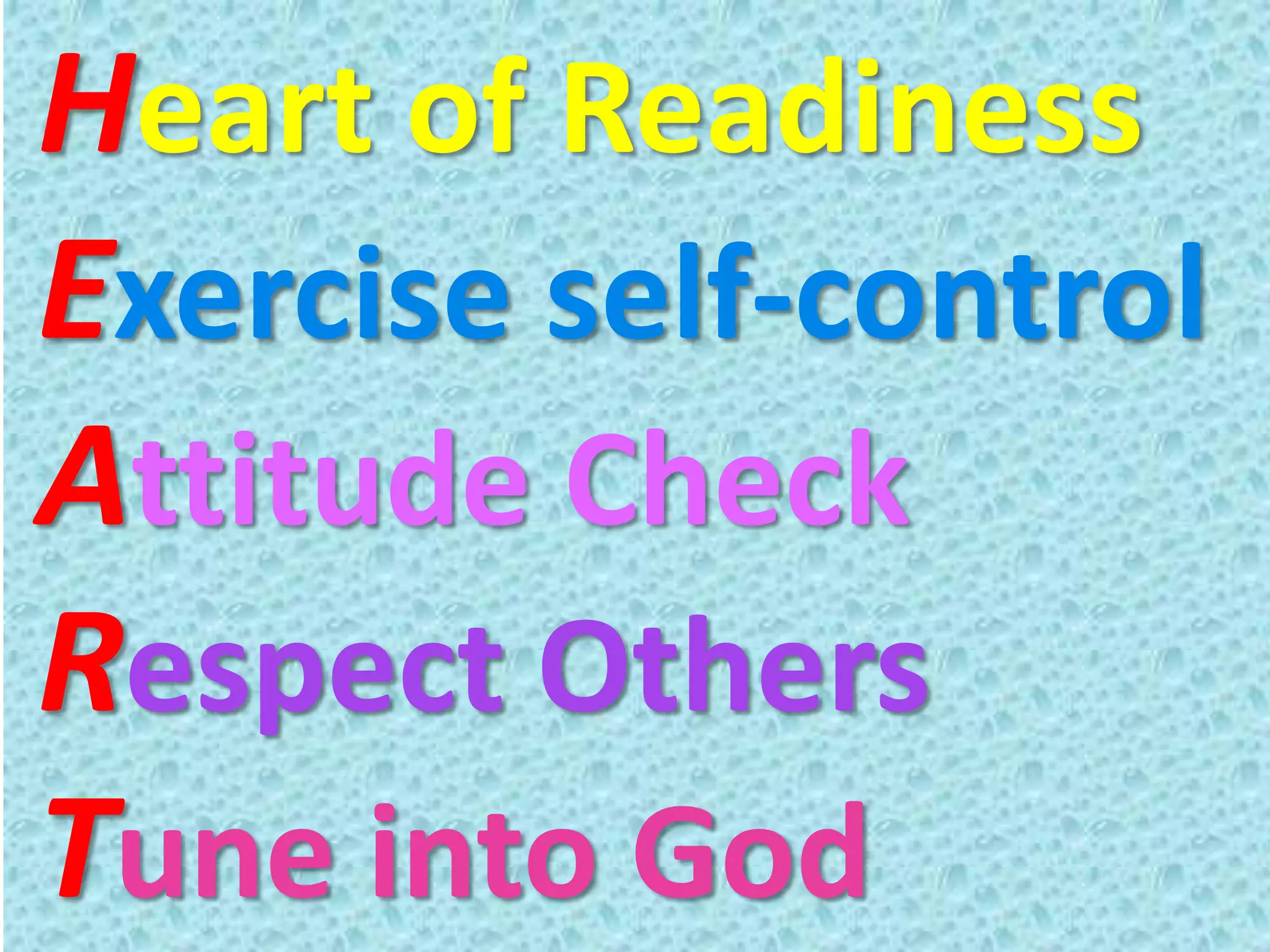 This short document provides a list of 5 items to focus on: exercise self-control, check your attitude, respect others, tune into God, and have a heart of readiness. It suggests cultivating control over one's impulses, maintaining a positive mindset, treating all people with dignity, connecting spiritually, and always being prepared.