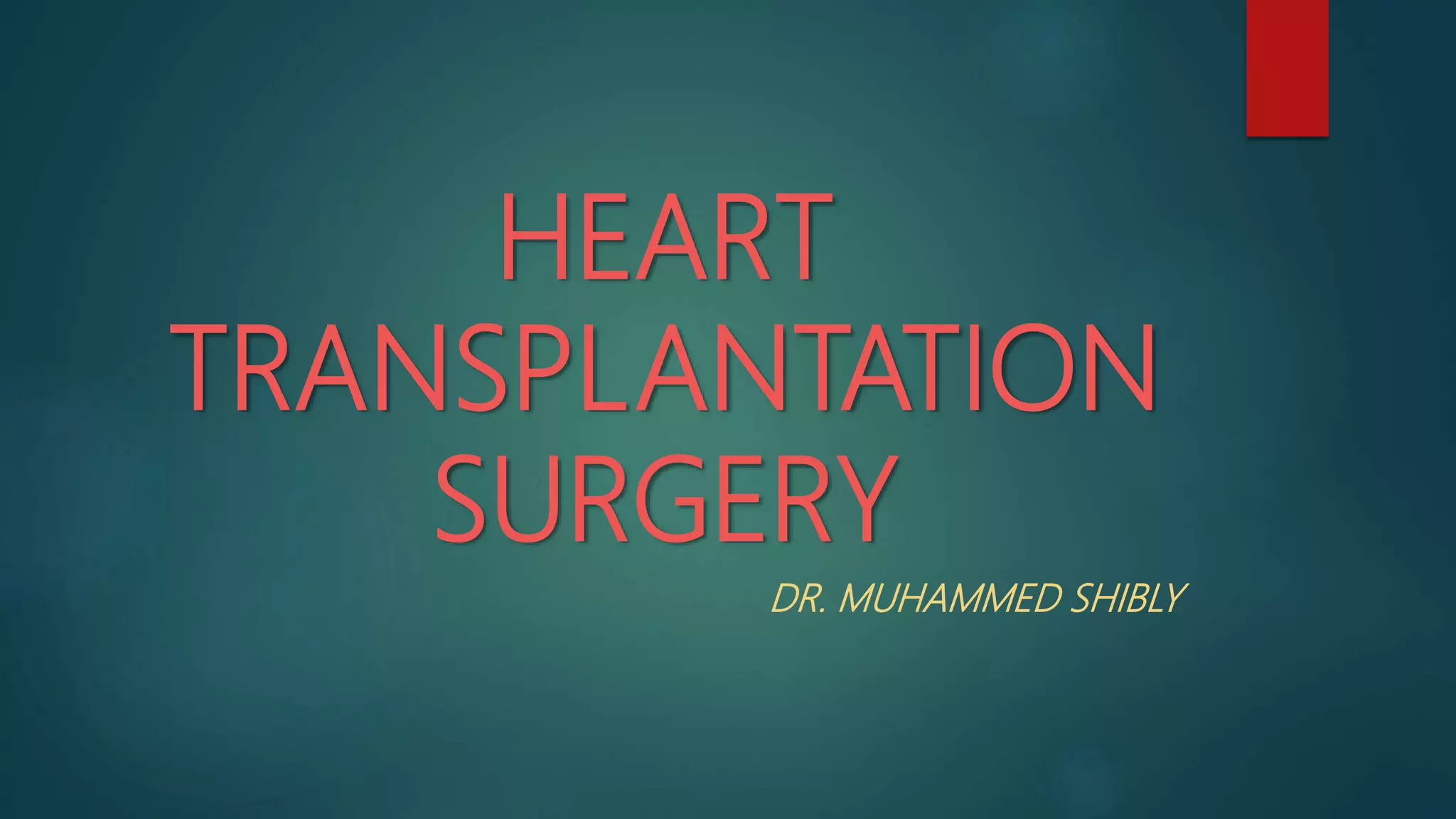 Cardiac transplantation involves surgically implanting a donor heart into a recipient with heart failure. It is indicated for end-stage heart disease that is refractory to maximal medical therapy. Absolute contraindications include active infections, cancers, and pulmonary hypertension. Evaluation of recipients includes cardiac testing and screening for medical/psychosocial risks. Donor hearts must be from brain dead individuals without systemic disease or infection. Post-operative care requires lifelong immunosuppression to prevent rejection while managing complications like infection, rejection, and arrhythmias. Long-term follow-up focuses on screening for issues like allograft vasculopathy.