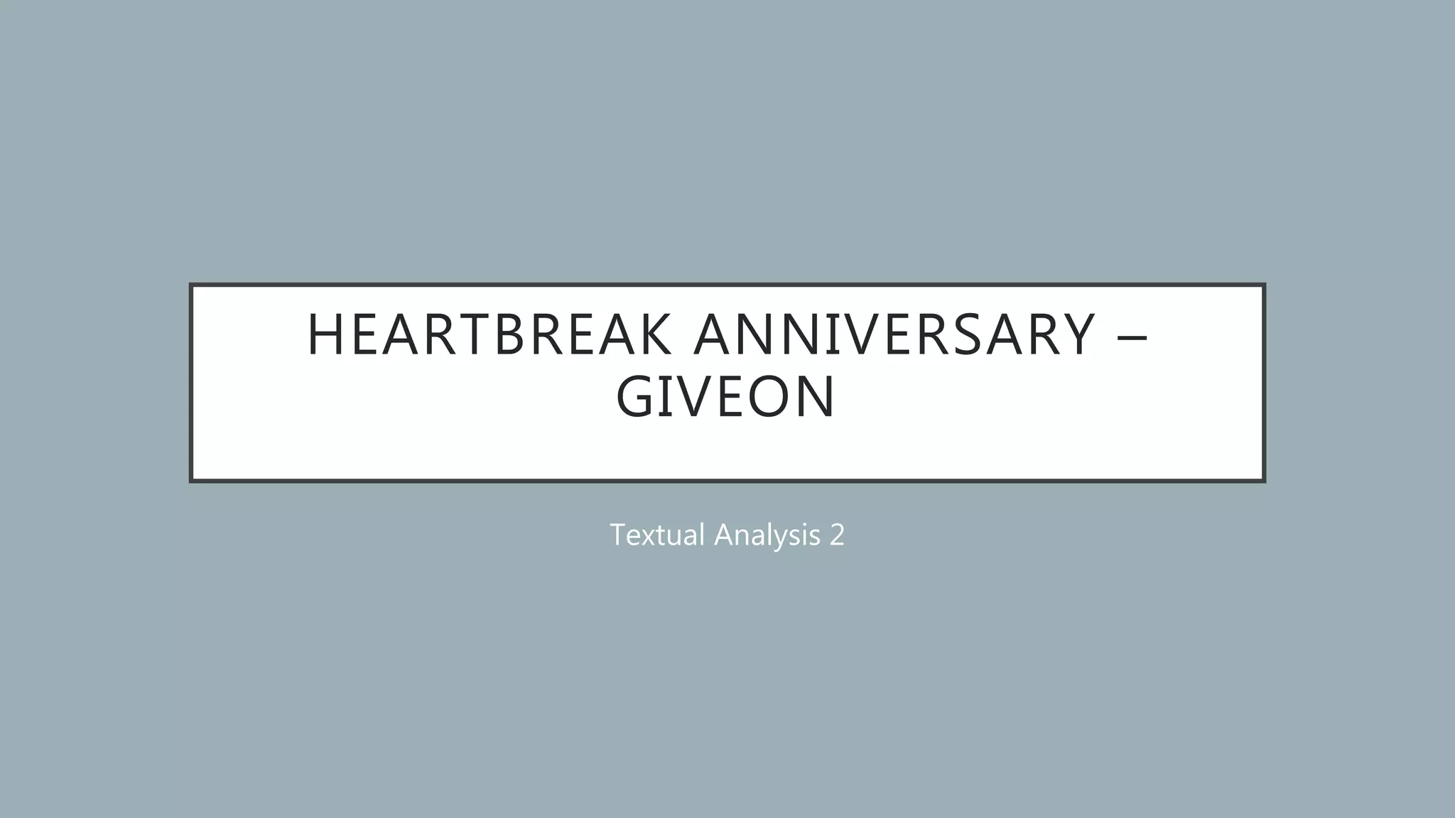 This document provides a textual analysis of the music video for "Heartbreak Anniversary" by Giveon. It summarizes the key elements of the music video including the casting of Giveon and Samantha Logan as the main characters, the locations featured representing places young adult couples would go, and the costumes being styled in a way popular in the early 2000s. The narrative depicts the relationship from its beginning to the breakup and aftermath. Flashbacks to happier times are shown in black and white. Silhouettes and smaller framed flashbacks are used to generate emotion and move the story. Soundtracks and edits are carefully chosen to further develop meaning and the relationship between visuals and lyrics.