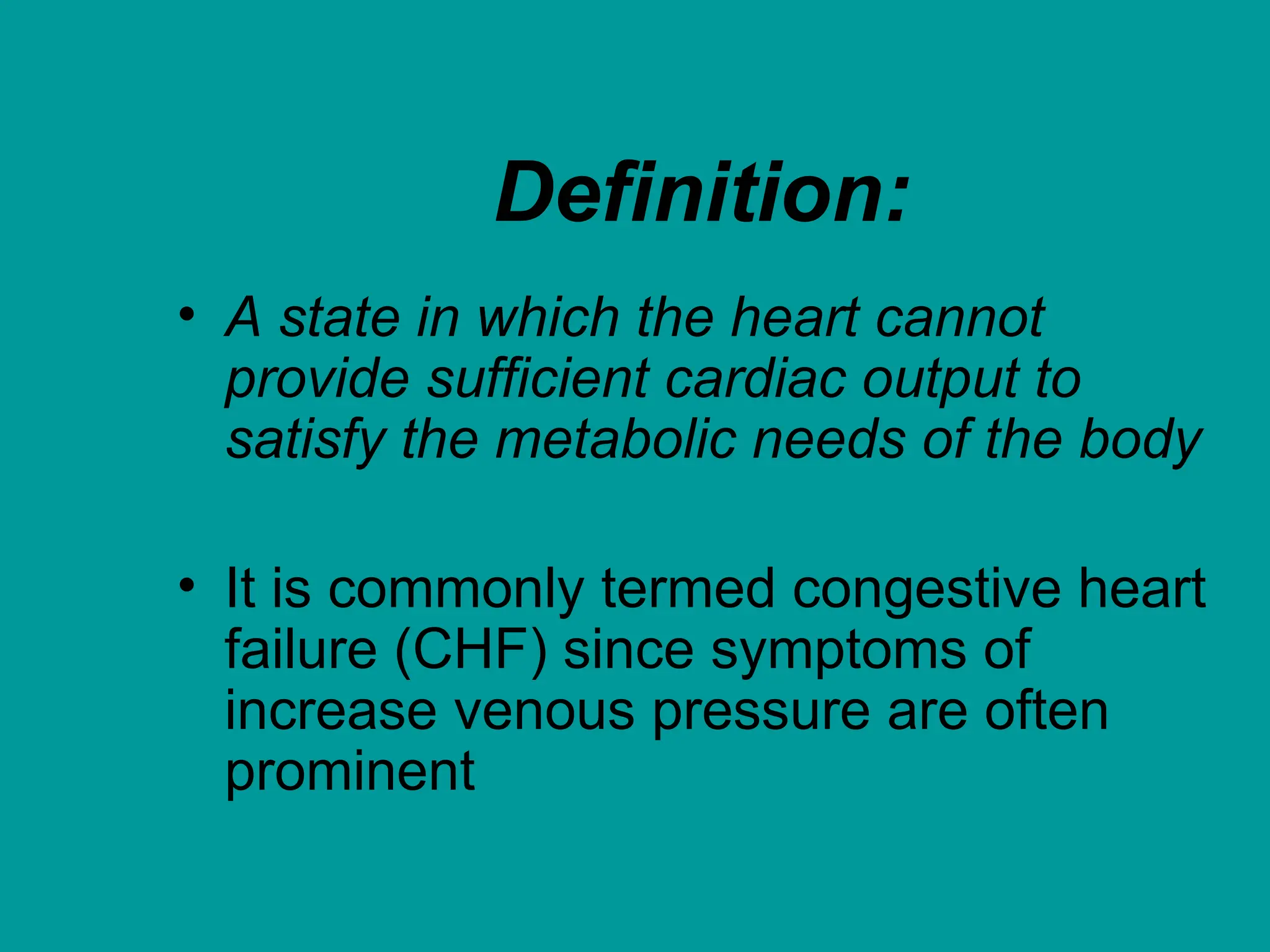 - Heart failure occurs when the heart cannot pump enough blood to meet the body's needs. It is commonly called congestive heart failure due to prominent symptoms of increased venous pressure.