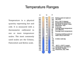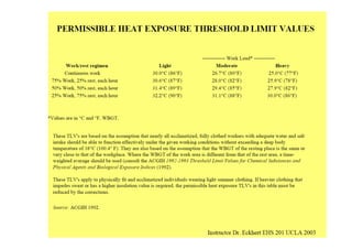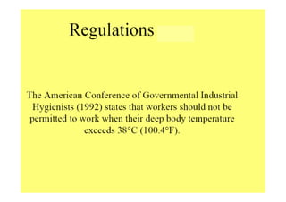 The human body responds to heat stress through various mechanisms controlled by the hypothalamic thermoregulatory center. When core body temperature rises above 37°C, the body initiates heat loss responses like sweating and vasodilation to transfer heat to the skin where it can be dissipated. If skin temperature drops below 37°C, heat production mechanisms like shivering are activated. Prolonged heat exposure can lead to heat illness ranging from mild conditions like heat cramps and heat edema to the life-threatening heat stroke. Acclimatization over 10 days allows the body to better regulate temperature and sweat in hot environments.