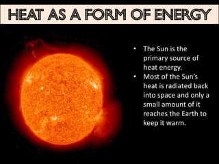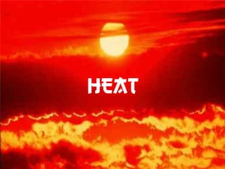 Heat is a form of energy that flows from hotter objects to cooler ones. It can be transferred through conduction, convection, or radiation. During conduction, heat transfers through direct contact of particles. Convection involves the circulation of currents in fluids (liquids and gases) from hotter to cooler regions. Radiation transfers heat through electromagnetic waves even without direct contact. Materials expand when heated and contract when cooled. Changes of state between solid, liquid, and gas occur at melting, boiling, condensation, and freezing points depending on temperature and pressure.
