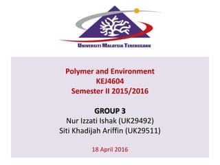 This document discusses stabilizers used in polymers to improve environmental stability against heat, light, and other environmental factors. It defines stabilizers as additives that inhibit polymer degradation and explains their importance. Heat stabilizers discussed include antioxidants that interfere with thermal oxidation through chain-breaking or preventive mechanisms. Light stabilizers described are UV absorbers, quenchers, hydroperoxide decomposers, and hindered amine light stabilizers. The document concludes that stabilizers increase polymer properties like strength and durability but further functionalization can be expensive.