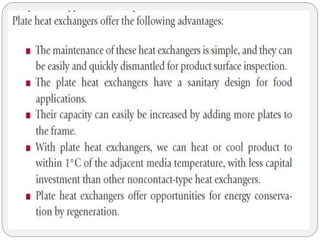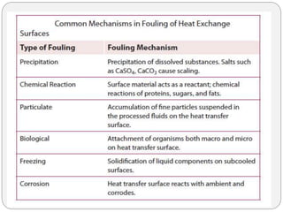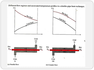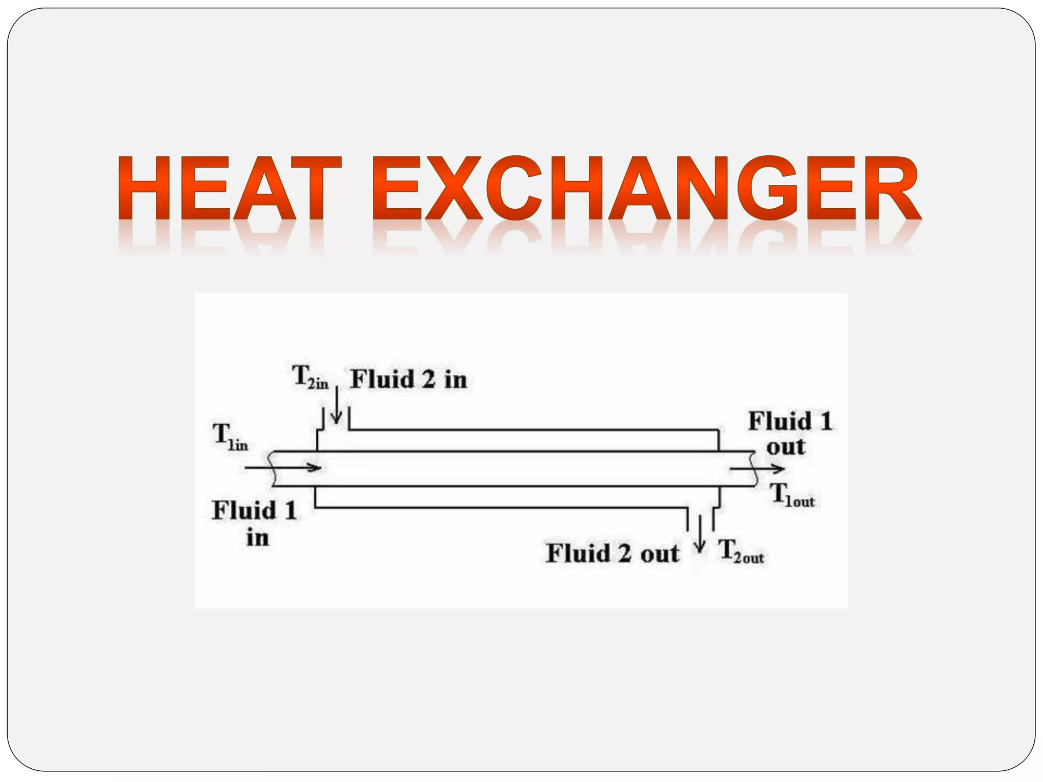 Heat exchangers transfer heat between two or more fluids. There are three main types: direct transfer, storage, and direct contact. Direct transfer type heat exchangers simultaneously flow hot and cold fluids through a separating wall. Storage type heat exchangers alternately flow hot and cold fluids through a porous matrix. Direct contact type heat exchangers do not separate the fluids. Common examples are plate heat exchangers and shell-and-tube heat exchangers. Design considerations include materials, operating parameters, fouling factors, and determining the required heat transfer area.