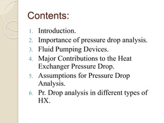 1. Heat exchanger pressure drop analysis is important because pumping power required is directly related to pressure drop and pressure drop affects heat transfer, operation, size, and cost.