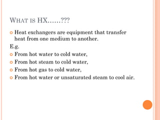 Heat exchangers are devices that facilitate the transfer of heat between different fluids, enabling operations such as heating, cooling, boiling, and condensing. They come in various forms, primarily tube and shell or plate types, and their efficiency can vary based on flow arrangements like parallel, counter, or cross flow. Additional methods, such as the log mean temperature difference (LMTD) and the number of transfer units (NTU), are utilized for calculating heat transfer effectiveness in these systems.