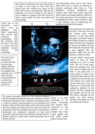 The poster contrasts the blue background with darkened, shaded characters that are difficult to see, creating a sense of mystery. The dark colors of the characters imply they are immoral and doomed. The blue background draws attention to the main characters and signals this is a thriller, as blue is a common color in that genre. The poster features Robert De Niro and Al Pacino, renowned for crime films, to attract fans of that genre. It depicts a machine gun to indicate the film contains both crime and action. Val Kilmer is centered between the two actors to suggest conflict within the plot.